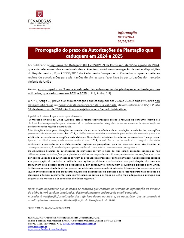 Informação Fenadegas 13/2024 – Prorrogação prazo de Autorizações de Plantação de Vinha que caduquem em 2024 e 2025